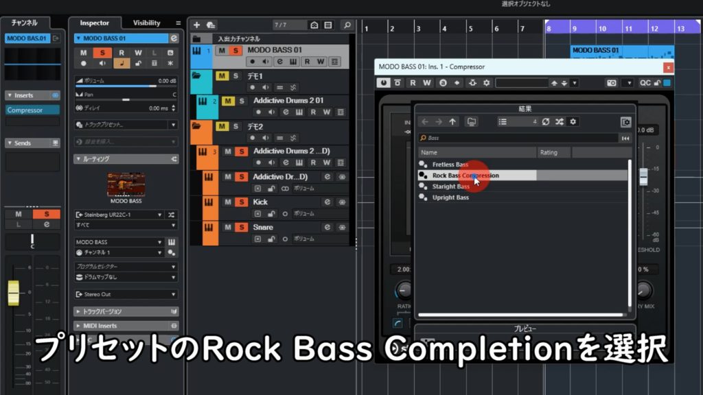 まずはキックの音量をちょうどいいバランスに整えたら、ベースにCubase純正プラグインCompressorのプリセットRock Bass Completionをかけましょう。