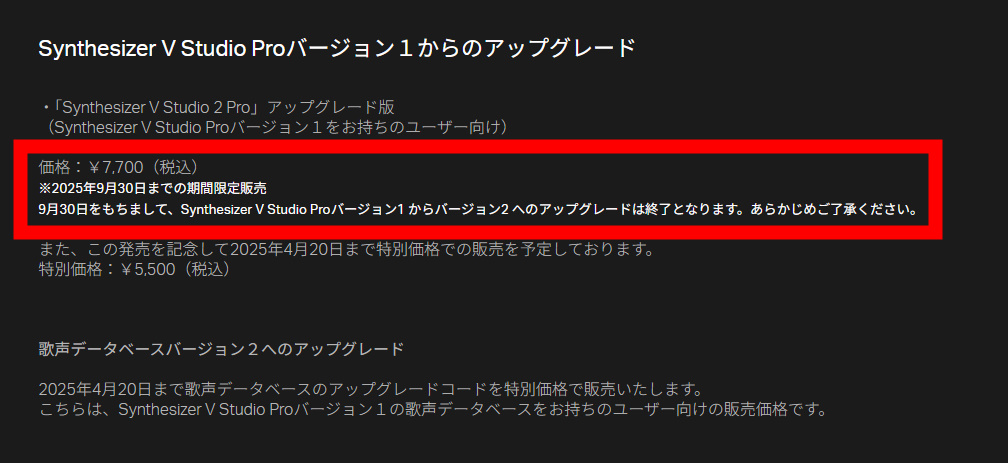 2025年3月に発売された Synthesizer V Studio 2 Pro ですが、V1からV2へのアップグレードは可能です。