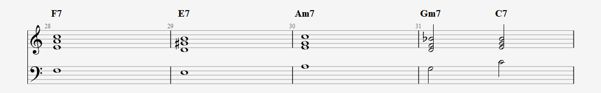 - ⅣM7 → Ⅲ7 → Ⅵm7 → Ⅴm7 → I7