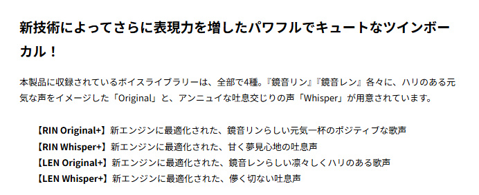 収録されているのは、リンとレンそれぞれ2種類のボイス元気いっぱいなオリジナル声と息を含んだウィスパーボイスの合計4種類が収録されています↓↓↓