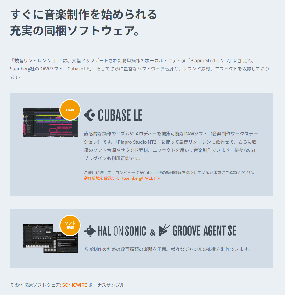 さらに専用エディターPiapro Studio NT2やDAW Cubase LEも同梱されているので、購入後すぐに楽曲制作を始められます。