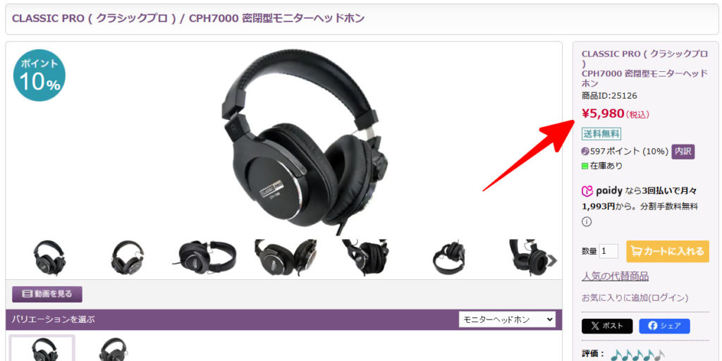 たとえば、「CLASSIC PRO CPH7000」というモニターヘッドホンは、Amazonより約1,000円安く購入でき、さらに10%分のポイントが付くこともあります。