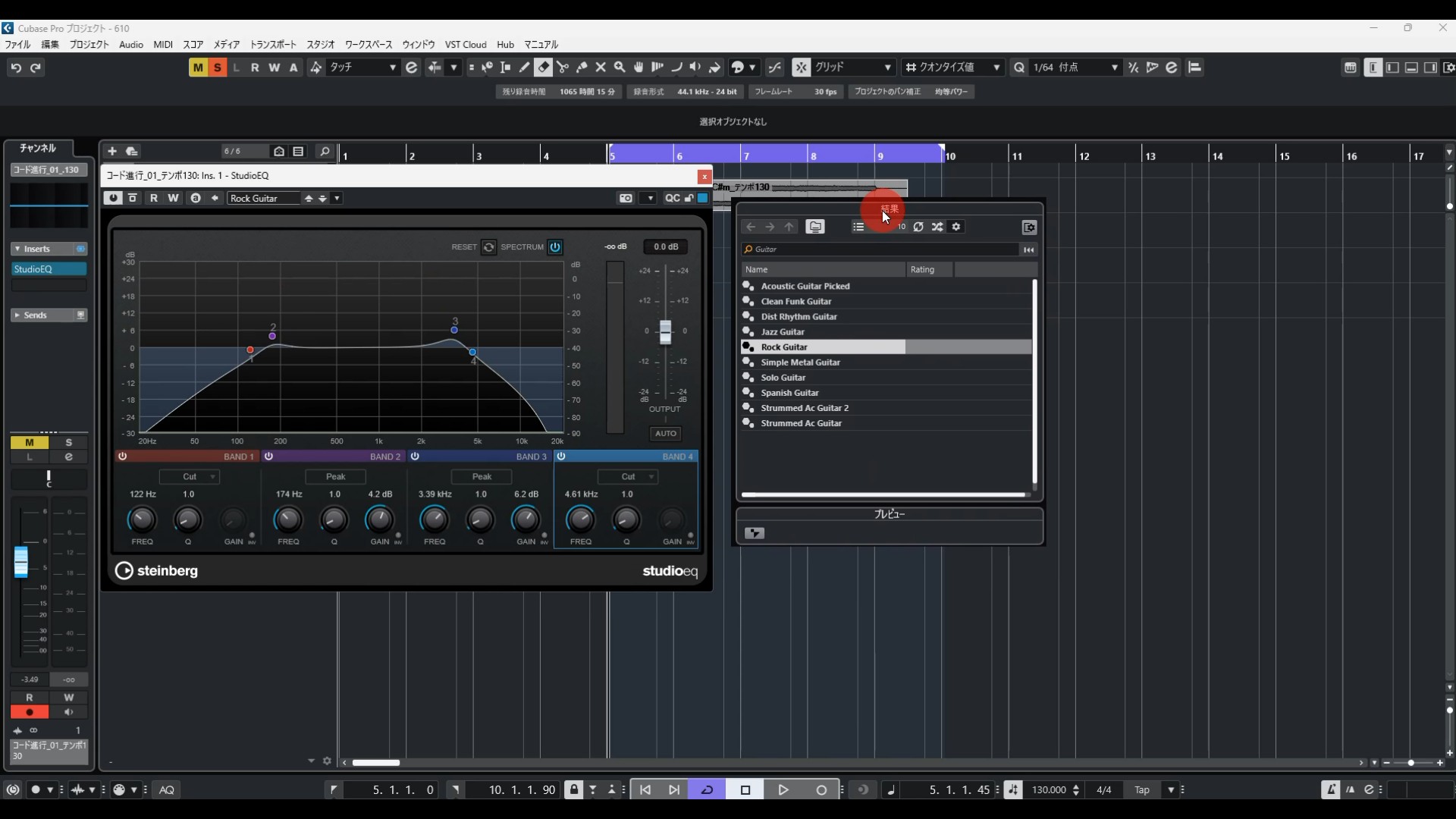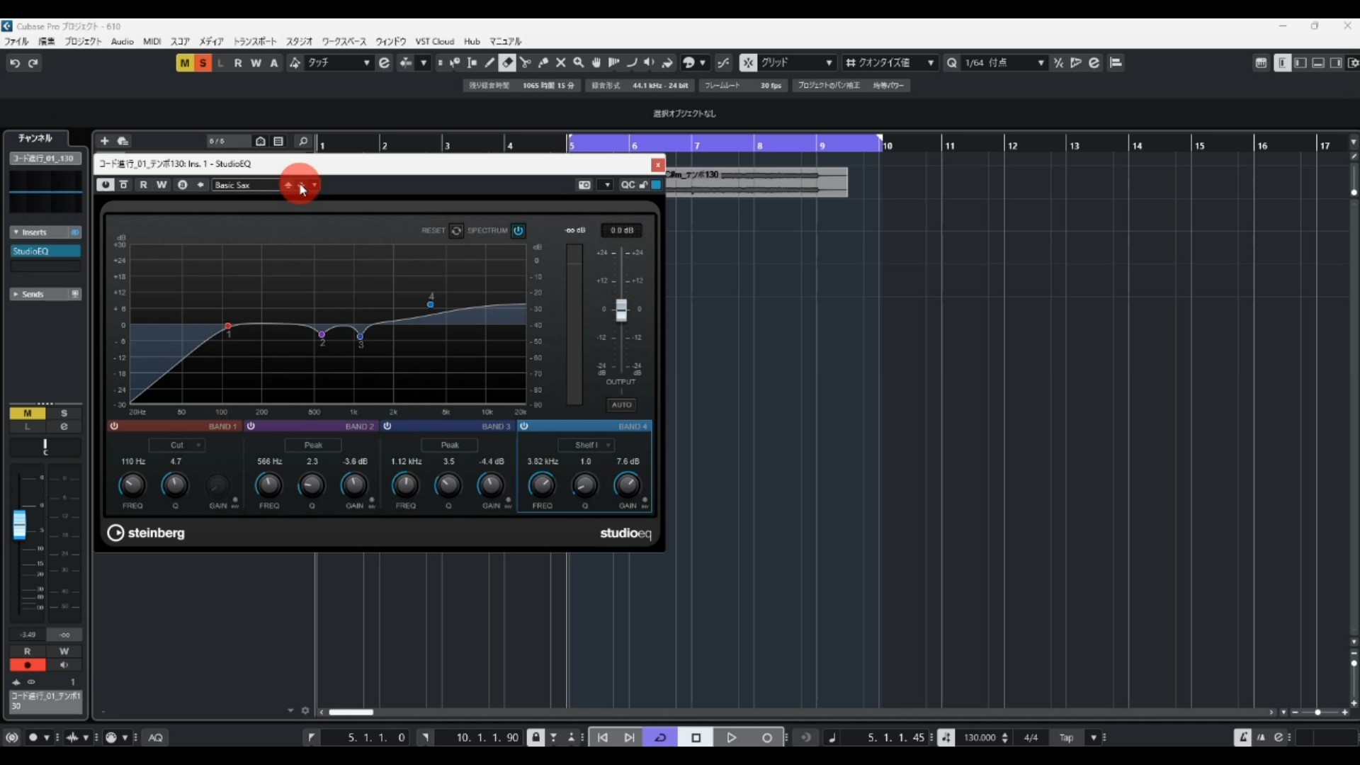 ちなみに、筆者はCubaseを使っていますが、純正プラグインStudio EQのプリセットの名前に楽器名が付いているので、調整したいパートのトラックに合ったプリセットを選ぶと、とても参考になりますよ。