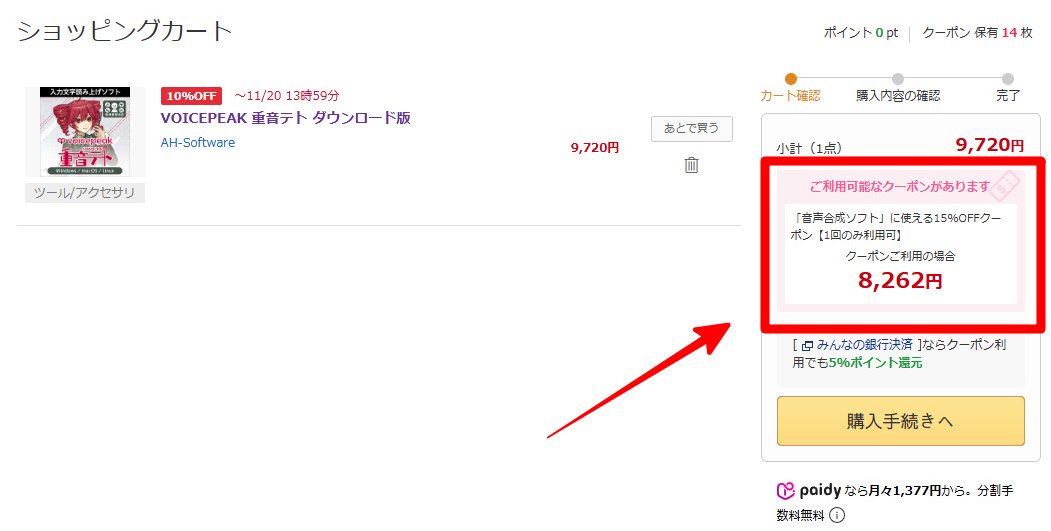 DLsiteでVOICEPEAKが10%OFFクーポンと15%OFFクーポンを併用で約2500円もお得に買えます。