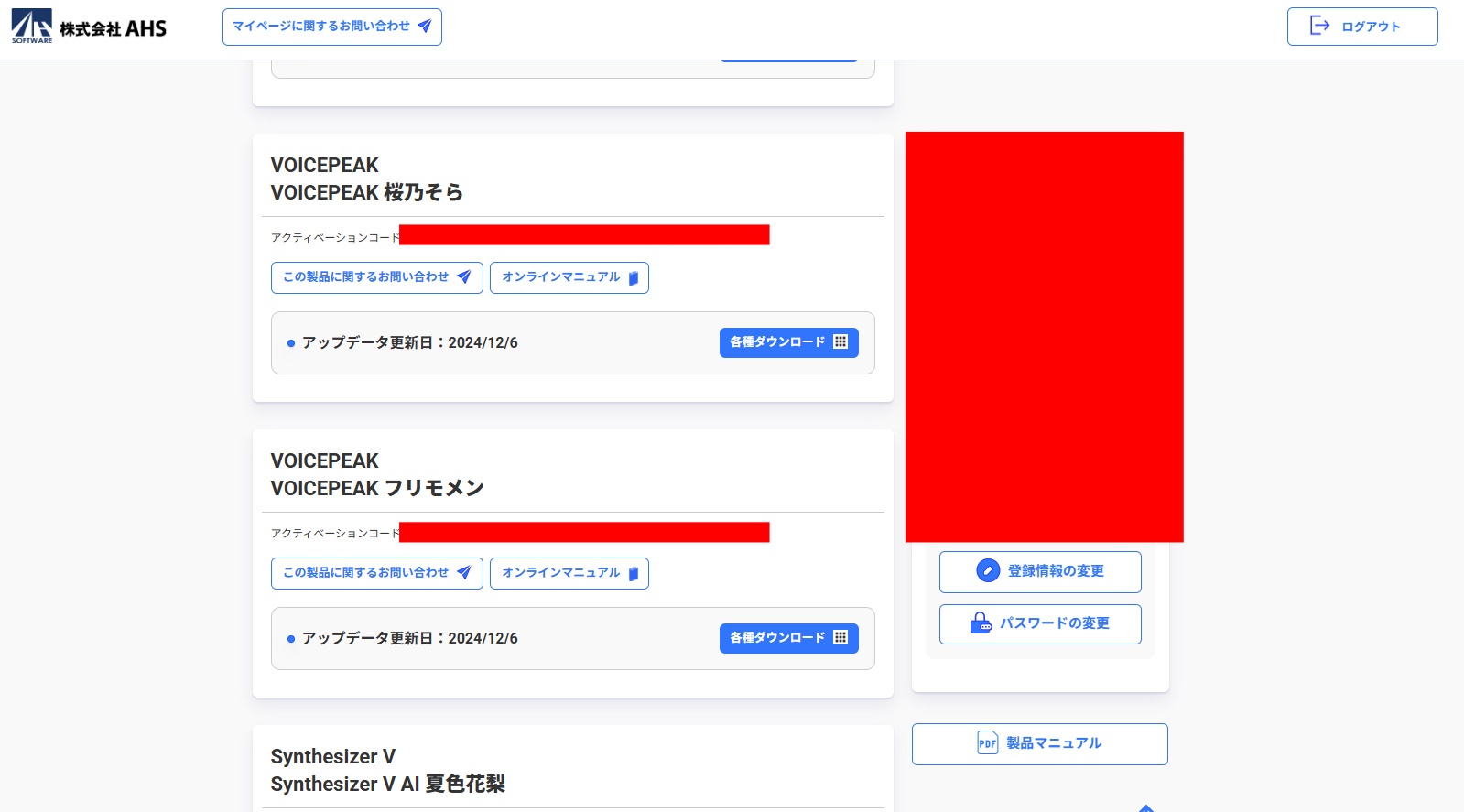 VOICEPEAKの販売元であるAHSにアカウントを作成しておくと、購入した製品のバックアップを保存できます。