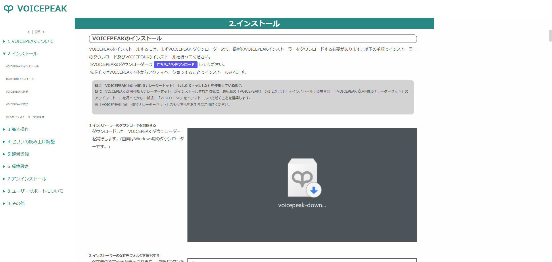 - VOICEPEAKの公式サイトに掲載されている手順に沿ってインストールを進める